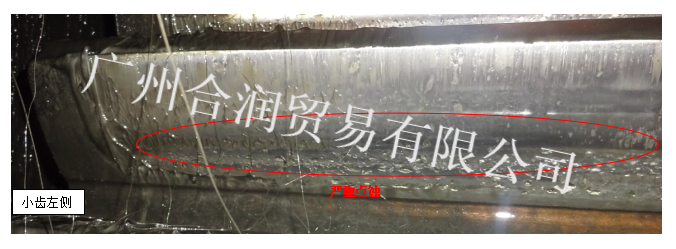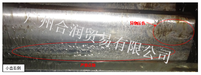 小齒齒面:齒根附近有大量嚴重點蝕貫穿齒面,且已有剝落痕跡。懷疑因長期潤滑不佳造成。齒面右側有異物壓傷痕跡。