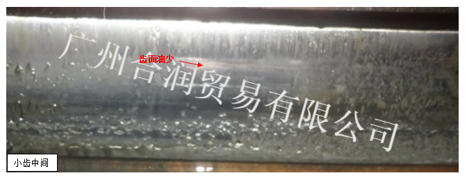 潤滑狀態:油池內半流體脂狀態如稀油,油品粘附性差,齒面附著油量較少,小齒中間幾乎無油,且密封性差導致現場有多處漏油。